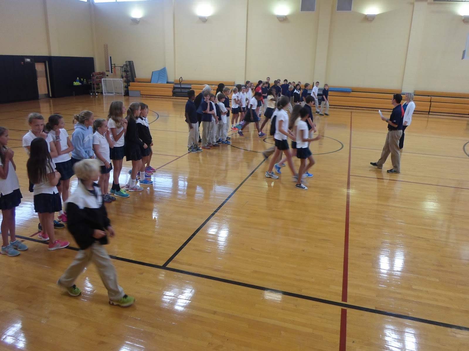 Today, the 6th grade came together for some team building activities, where they learned more about one another, and had to work cooperatively to accomplish a goal. We had two large circles, and the students joined hands. They had to pass a hula-hoop from one person to another without breaking the chain of hands. GIRLS WON! :-) Then, they completed a crossing the line activity, where we lined them up on one line and read questions to them. If the question pertained to them, they had to cross the half court line and turn and face their peers, then return to the main line. We asked questions like...."Have/Were you ever...."